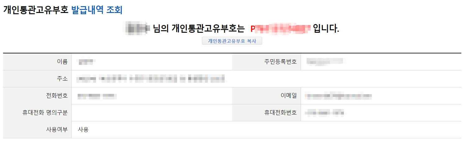인증만 받으면 개인통과번호는 발급이 완료됩니다.