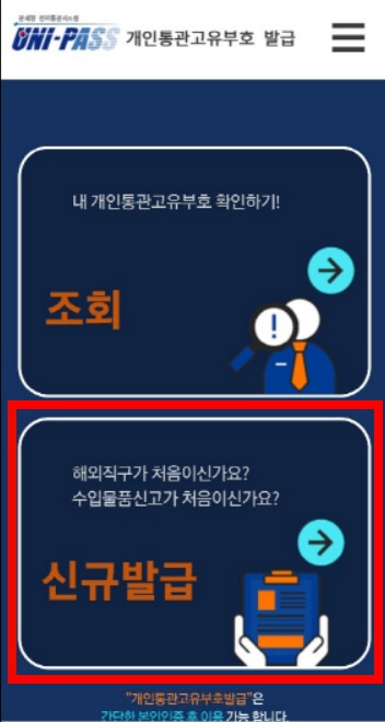 첫 화면에서 이미 통관번호를 발급받았다면 조회를 클릭해서 확인할 수 있고 처음 발급한다면 신규발급을 클릭합니다.