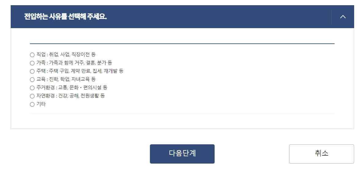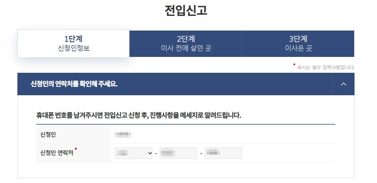 3. 신청인 정보와 전입사유를 선택한 후 다음단계를 클릭합니다.