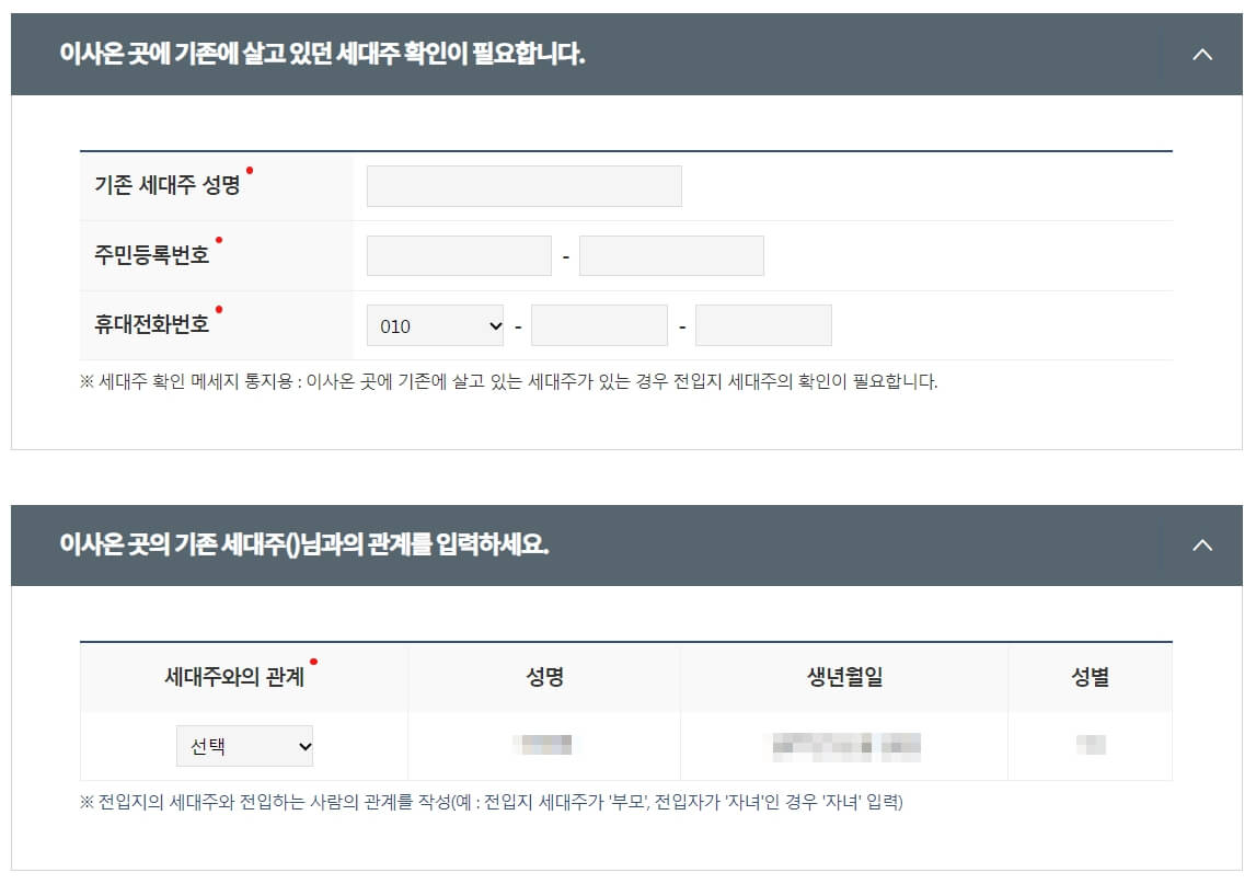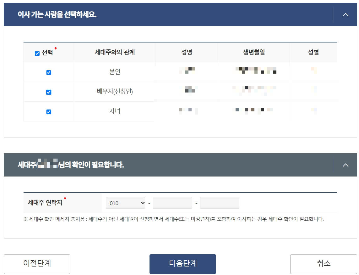 세대주가 아닌 세대원이 신청하면서 세대주(또는 미성년자)를 포함하여 이사하는 경우에는 기존 세대주 확인이 필요합니다.
