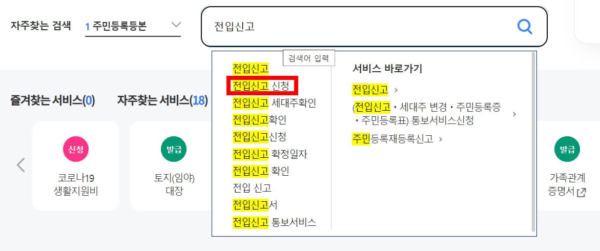 1. 첫 화면의 검색창에 전입신고 신청을 입력하여 검색합니다.