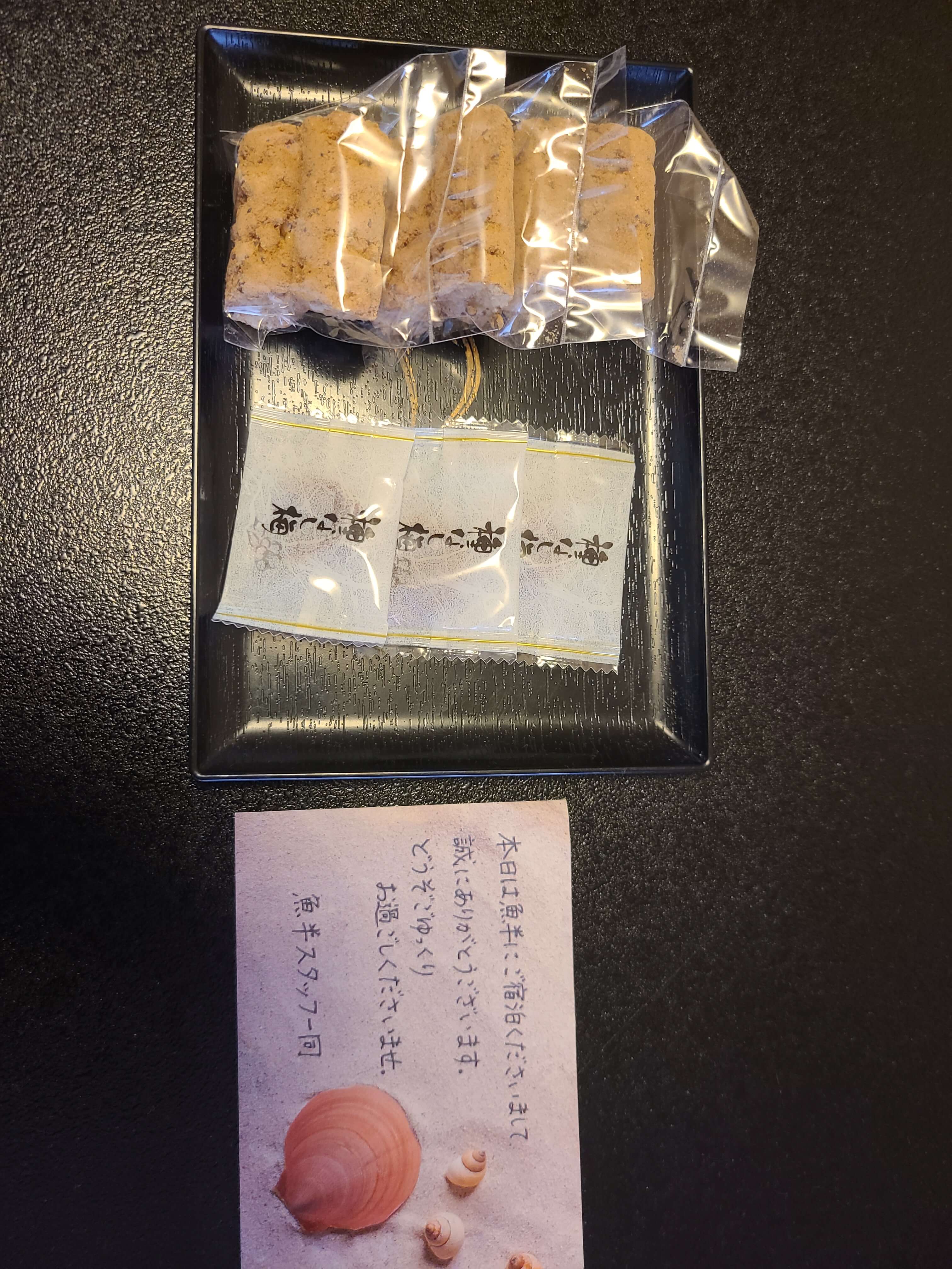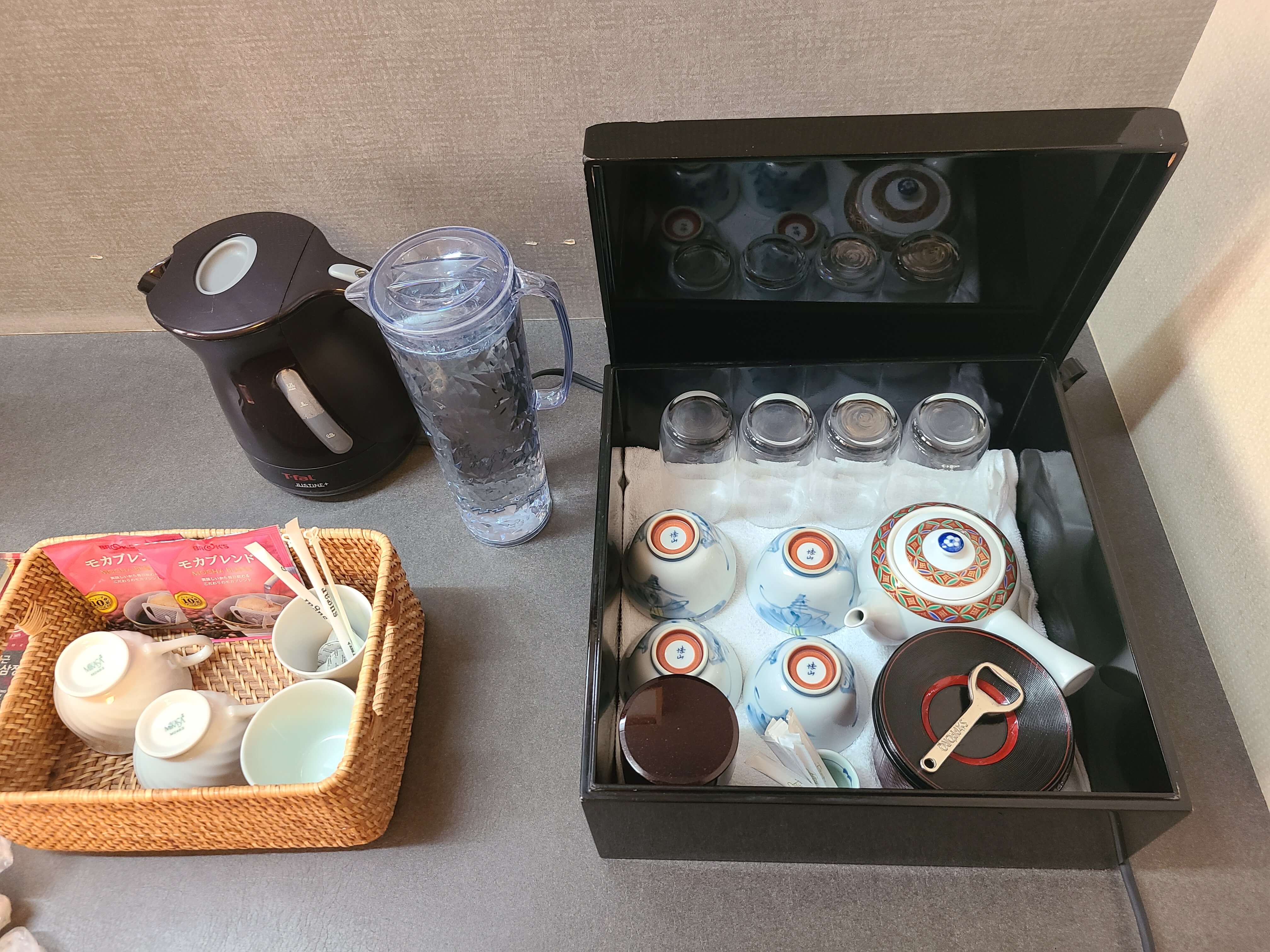 방에는 녹차와 다기세트와 커피포트가 있고 약간의 과자가 있습니다.