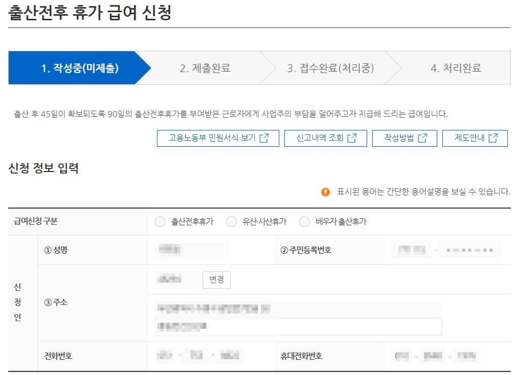 출산전후 휴가 급여 신청서 작성 후 제출하면 신청은 완료됩니다.
