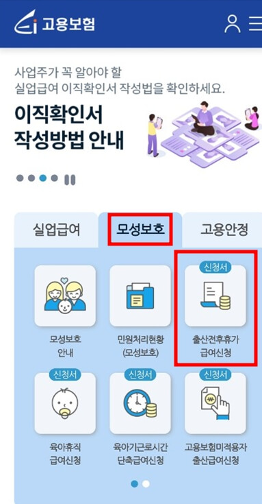 메인페이지에서 모성보호 클릭 → 출산전후 휴가급여 신청을 클릭합니다.